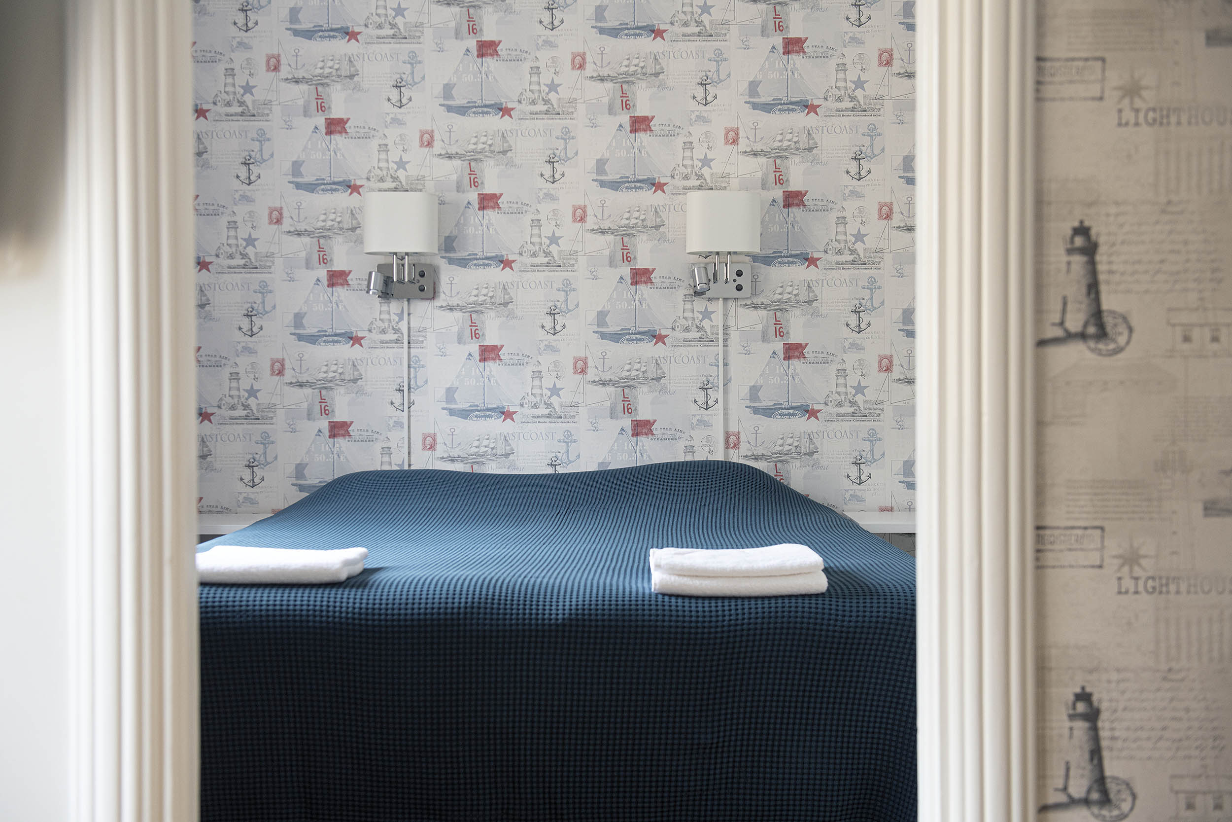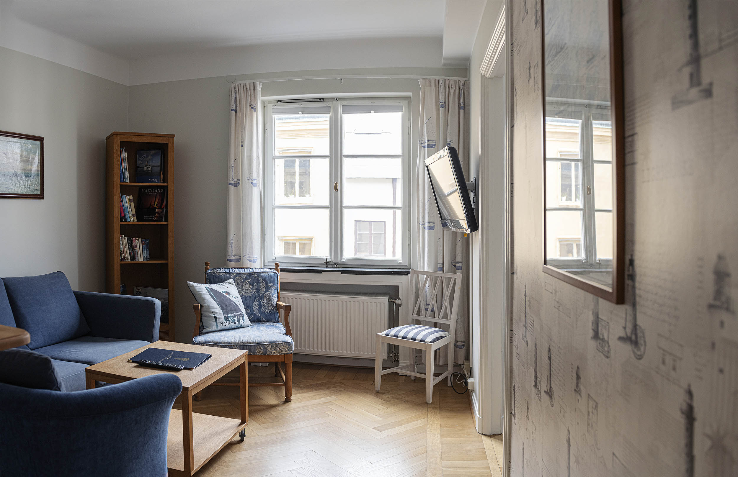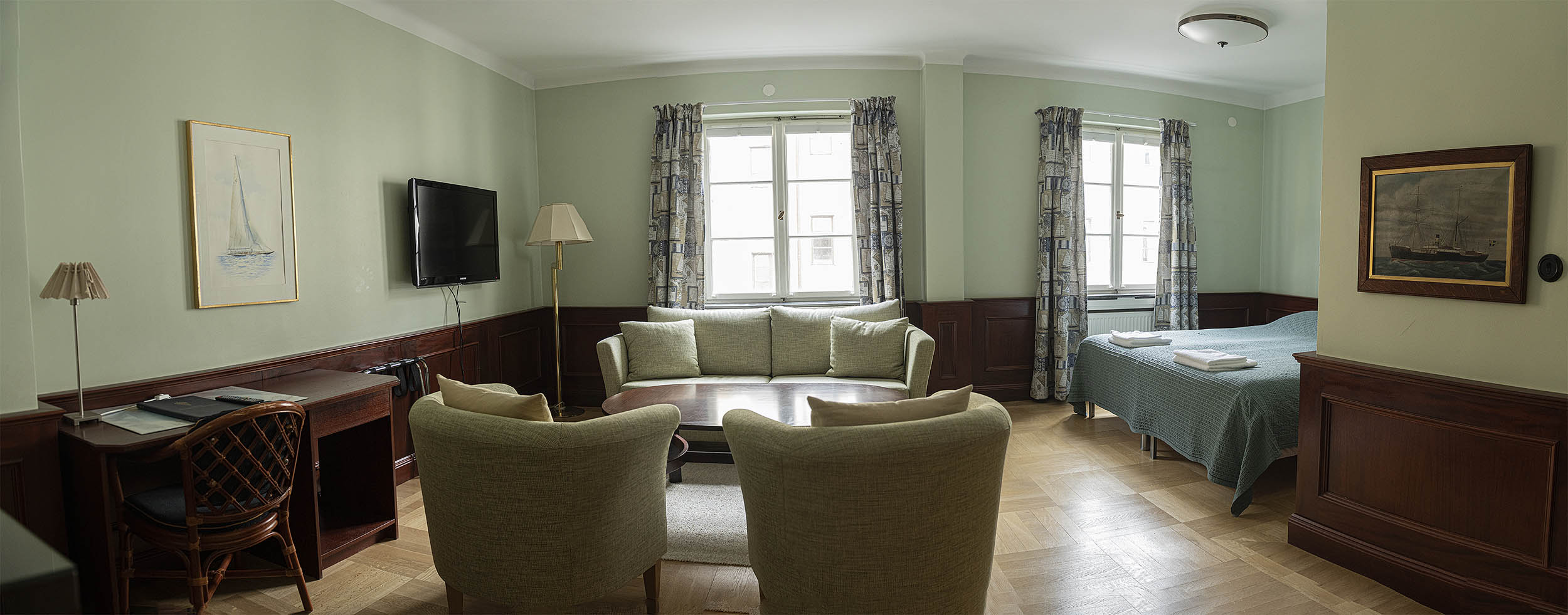 Captain's double - är mycket bra och prisvärda rum för dig och din partner. Vi har även ett rum med tre bäddar som är perfekt för en familj eller goda vänner. Rummen är möblerade i rustik marin stil. Konsten i rummen är genomgående i marin stil med fartyg och båtar i olika miljöer. Säkerhetsskåp på de flesta rummen.